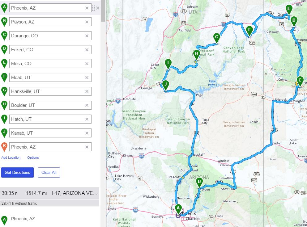 Durango, CO then on to Hanksville, UT and the last night I spent in Page, AZ. Below you will find the route I took.